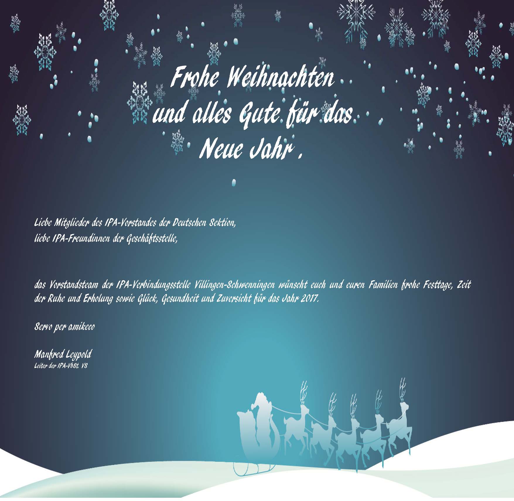 Liebe IPA-Freundinnen- und Freunde, sehr geehrte Besucher unserer IPA Sachsen – der geschäftsführende Vorstand der Landesgruppe Sachsen wünscht Ihnen allen eine frohes Fest, friedliche und besinnliche Feiertage. Gleichzeitig bedanken wir uns für die geleistete Arbeit für die Ziele unseres Vereins.