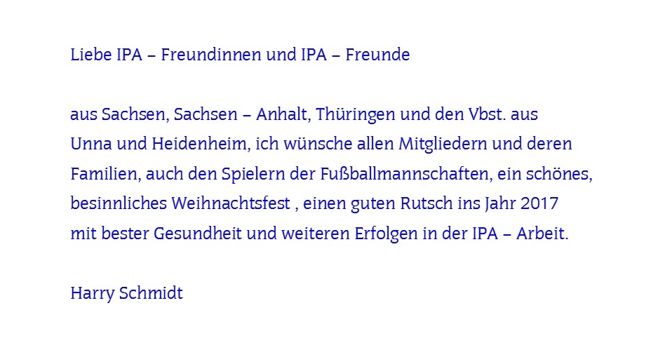 Liebe IPA-Freundinnen- und Freunde, sehr geehrte Besucher unserer IPA Sachsen – der geschäftsführende Vorstand der Landesgruppe Sachsen wünscht Ihnen allen eine frohes Fest, friedliche und besinnliche Feiertage. Gleichzeitig bedanken wir uns für die geleistete Arbeit für die Ziele unseres Vereins.